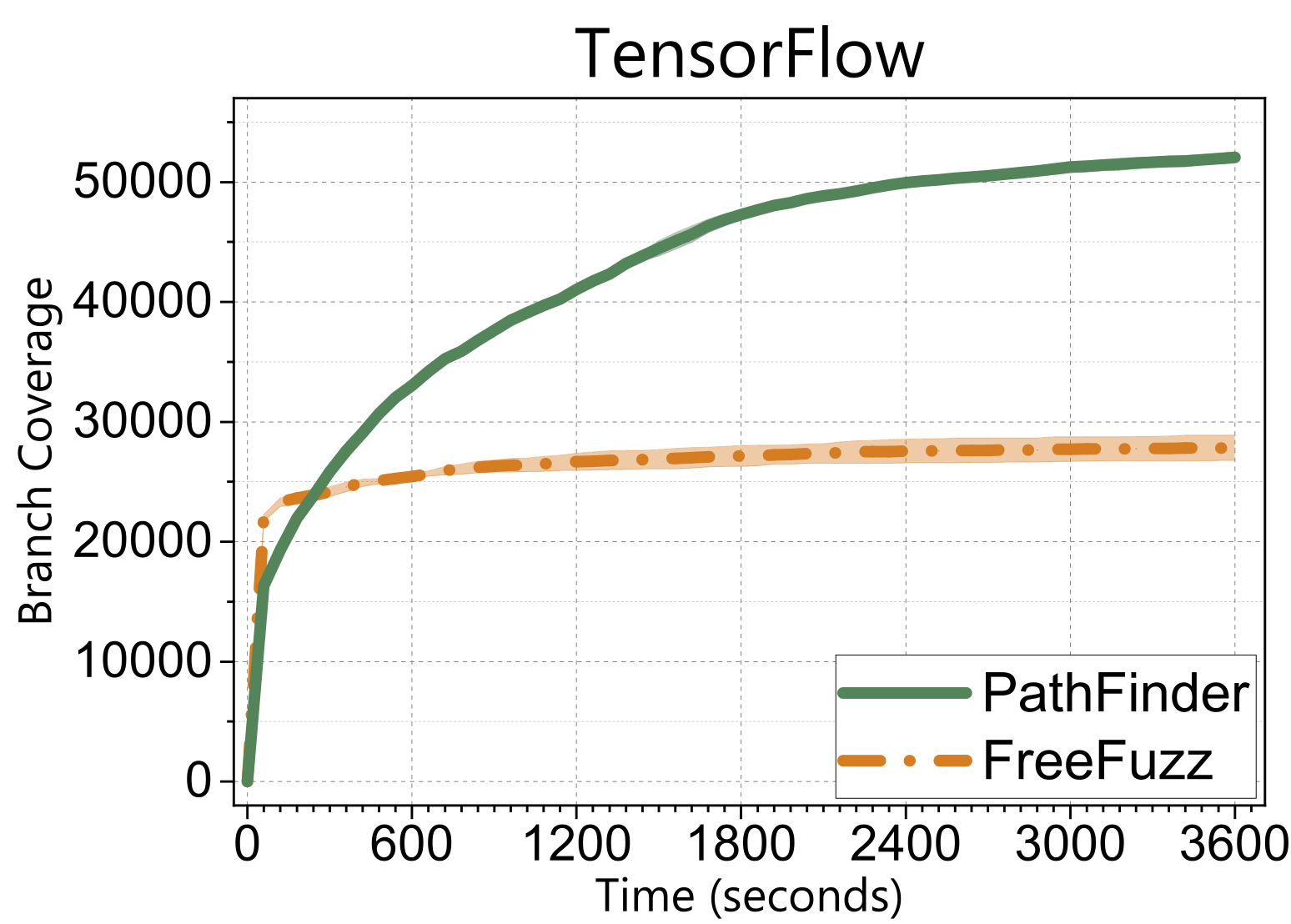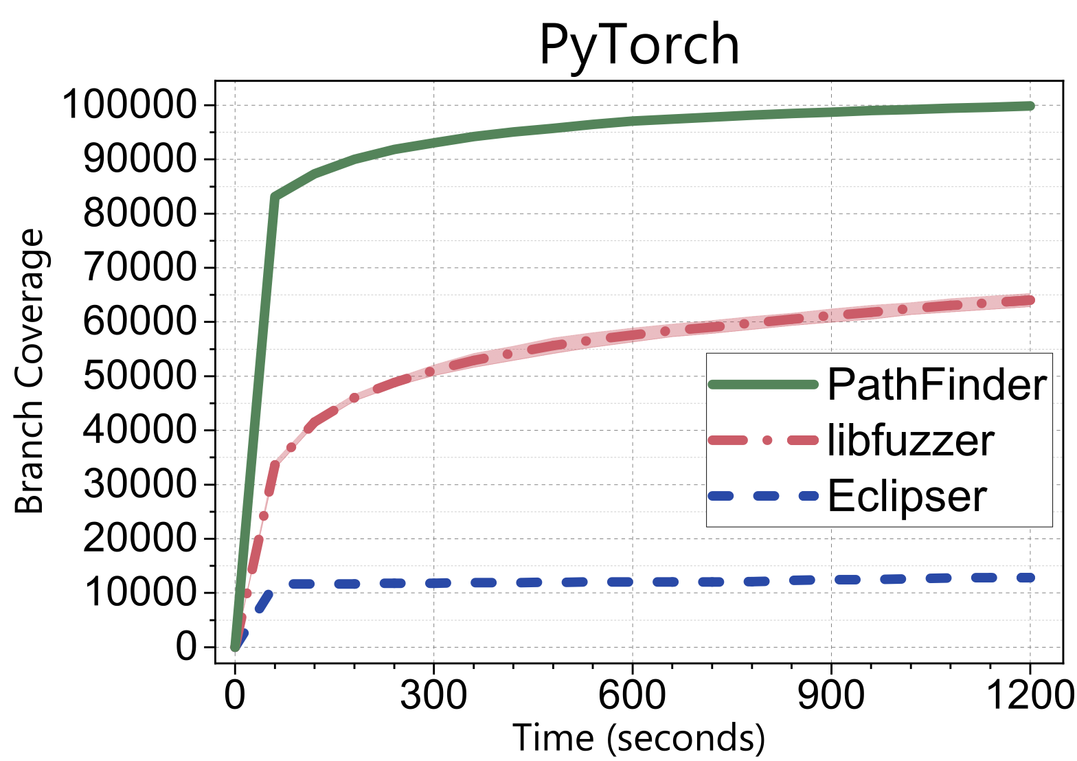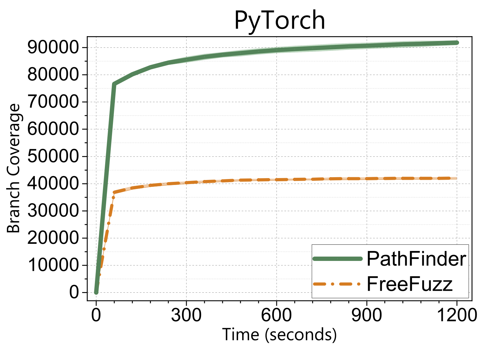 Let me first show you a snippet of the results. We applied our lightgrey-box fuzzing named PathFinder to a well-known deep learning library, PyTorch. These plots show how branch coverage increases over time. Clearly, our approach overwhelmingly outperforms the existing SOTA tools using various approaches.