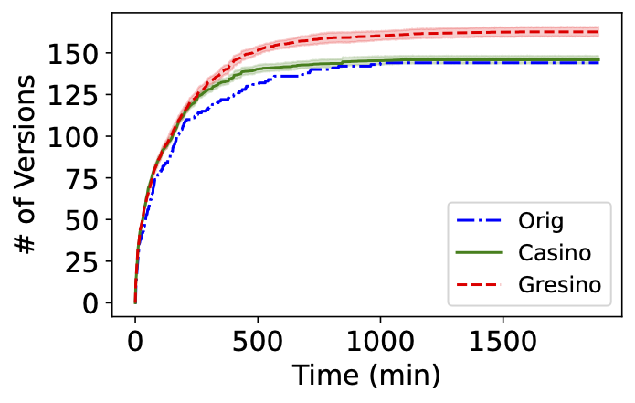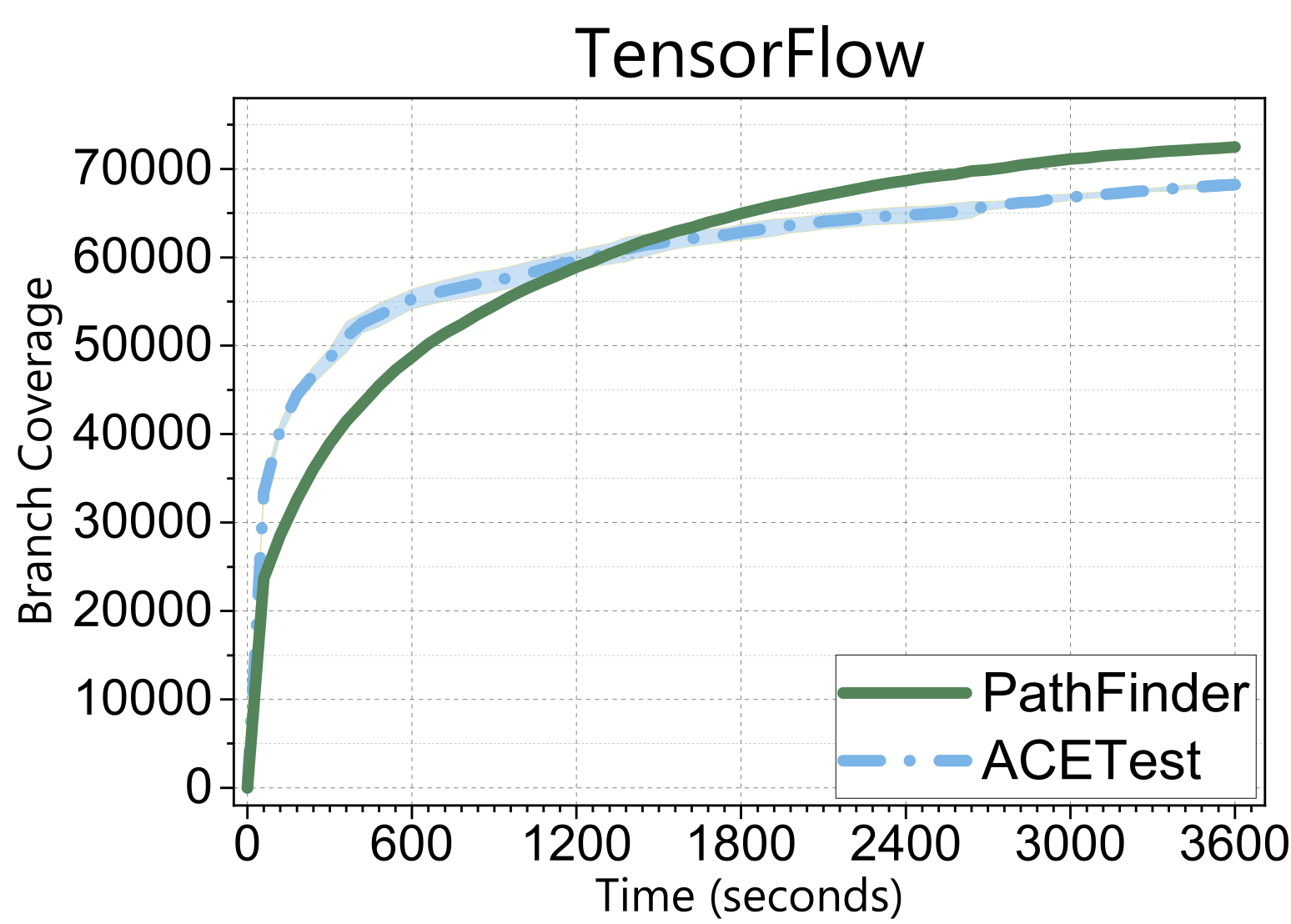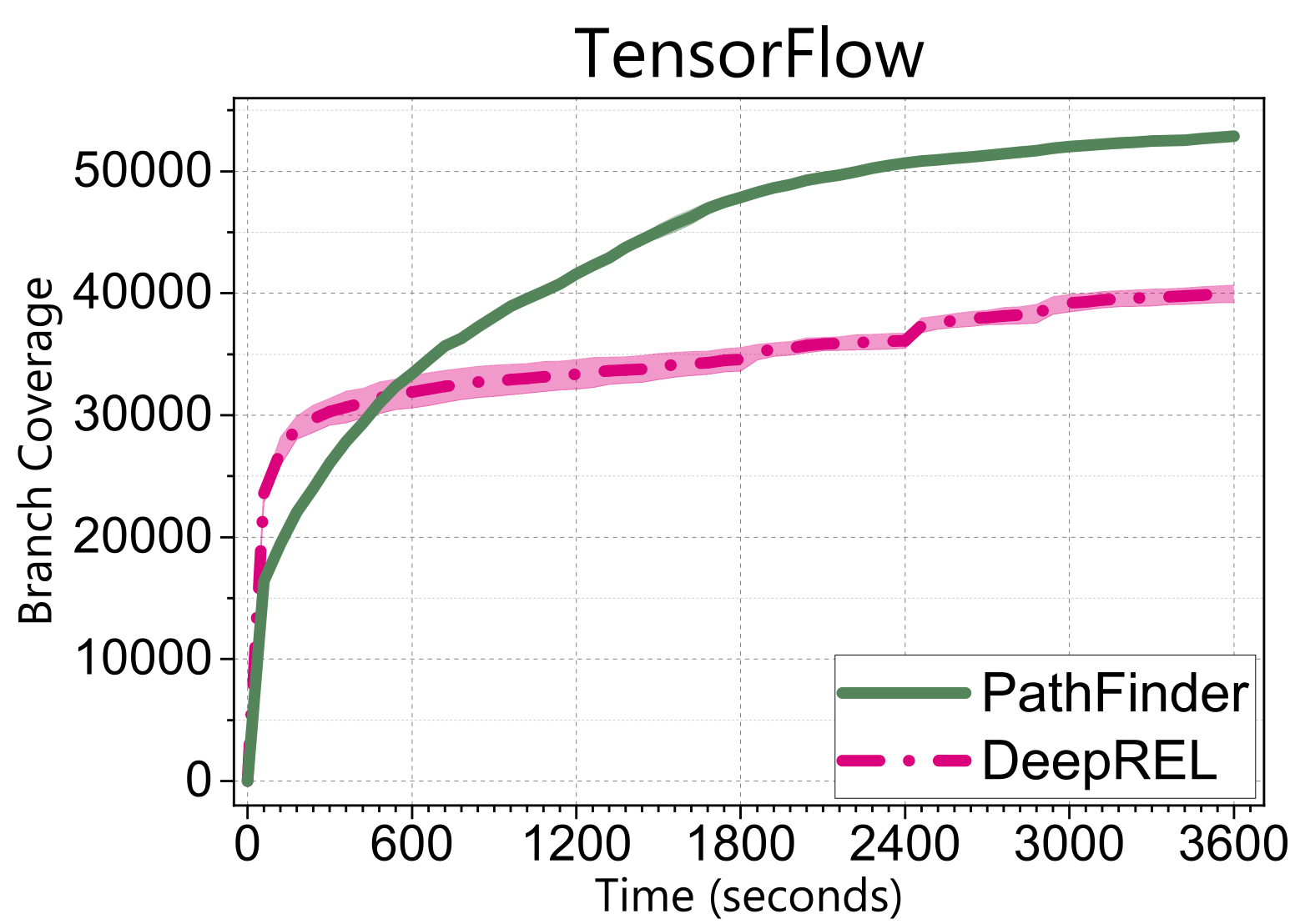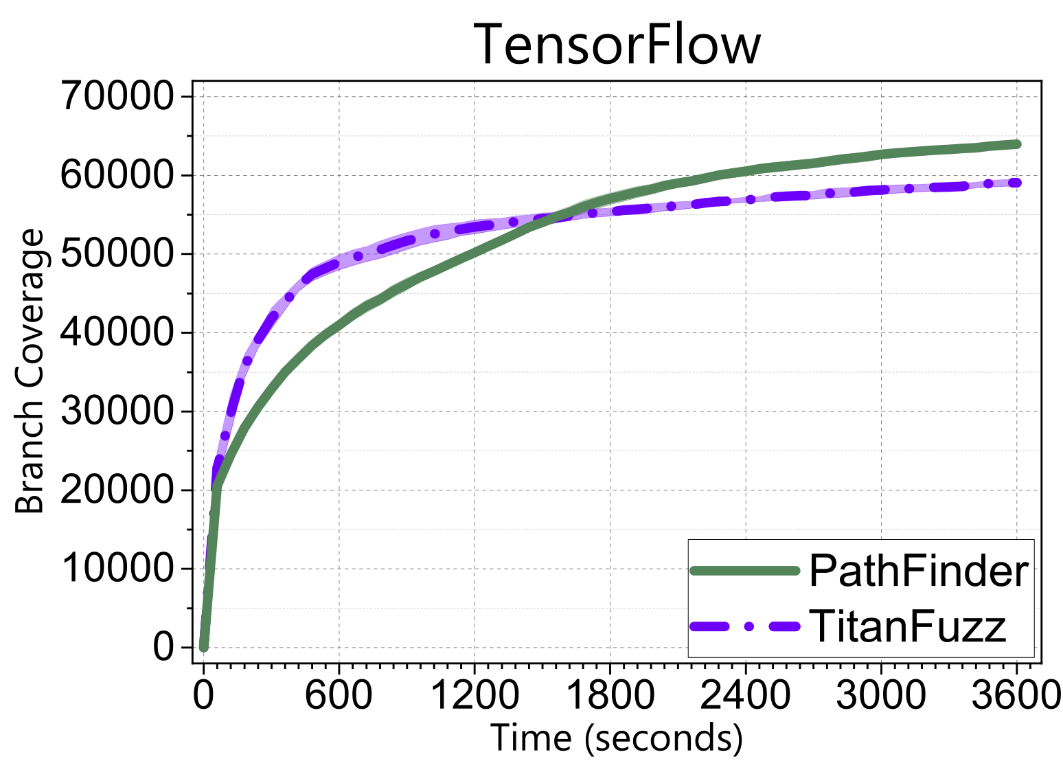 Let me first show you a snippet of the results. We applied our lightgrey-box fuzzing named PathFinder to a well-known deep learning library, PyTorch. These plots show how branch coverage increases over time. Clearly, our approach overwhelmingly outperforms the existing SOTA tools using various approaches.