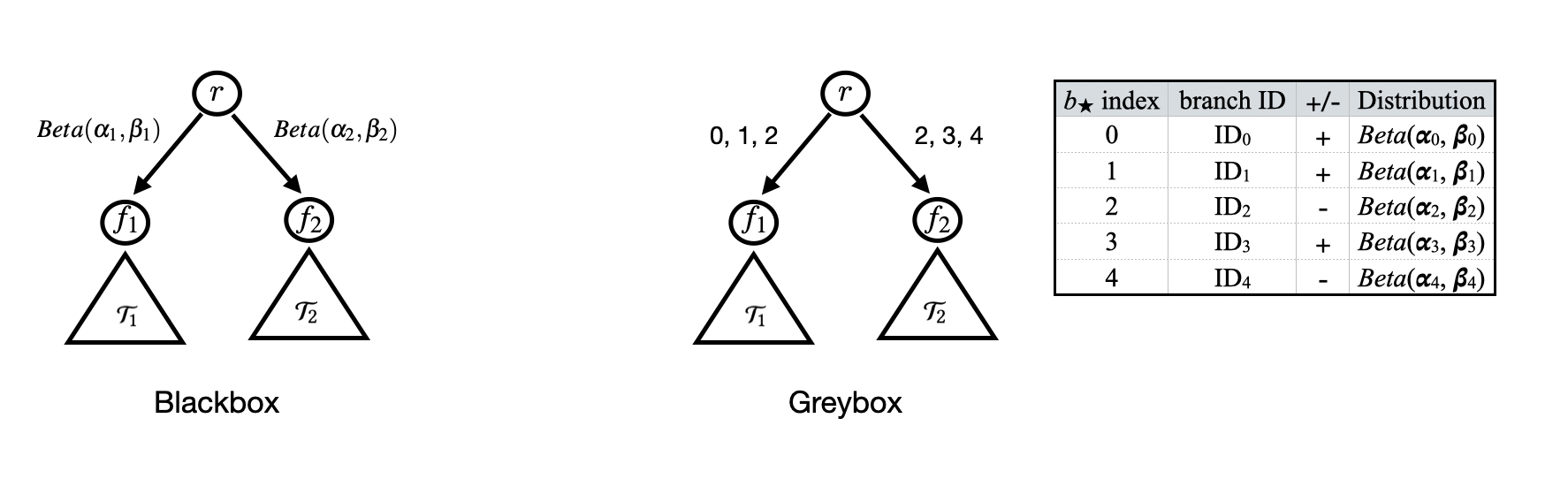 Each edge is associated with critical branches. These critical branches are obtained after executing interesting patches observed in the corresponding subtree. Unlike in the black-box approach, we assign a beta distribution to each critical branch.