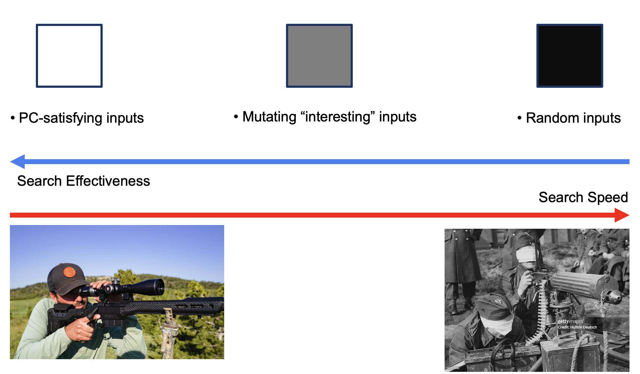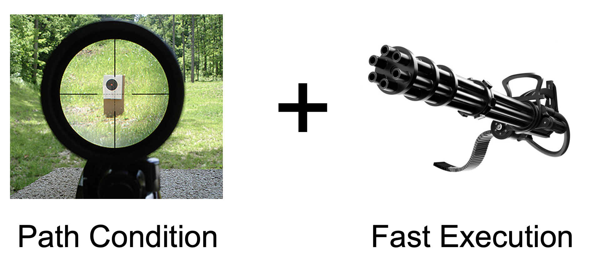 White-box fuzzing is like using a sniper rifle. Each shot is slow but, but it hits a new path every time.