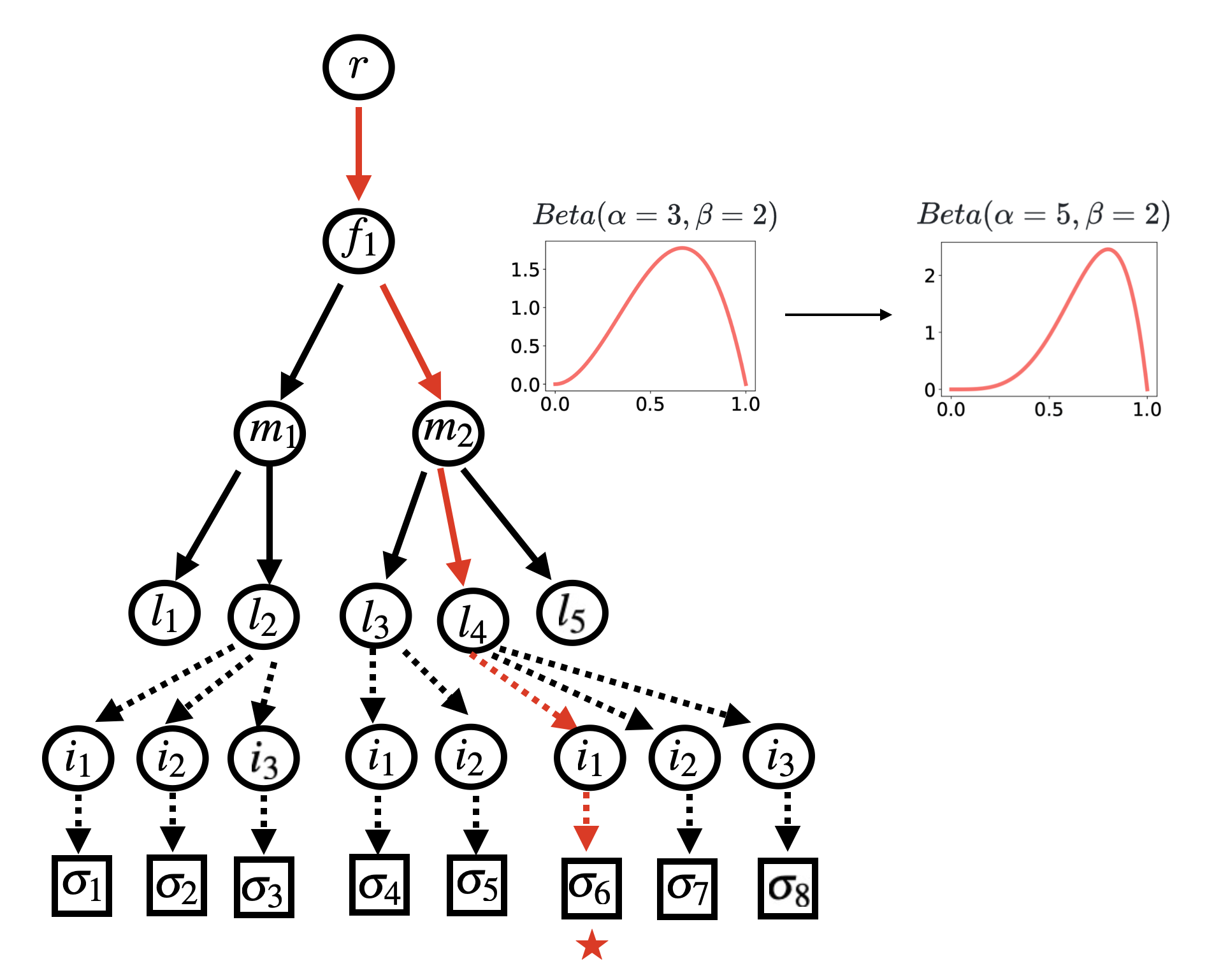 - Distribution of $\theta_k$: Beta distribution $(\alpha_k, \beta_k)$